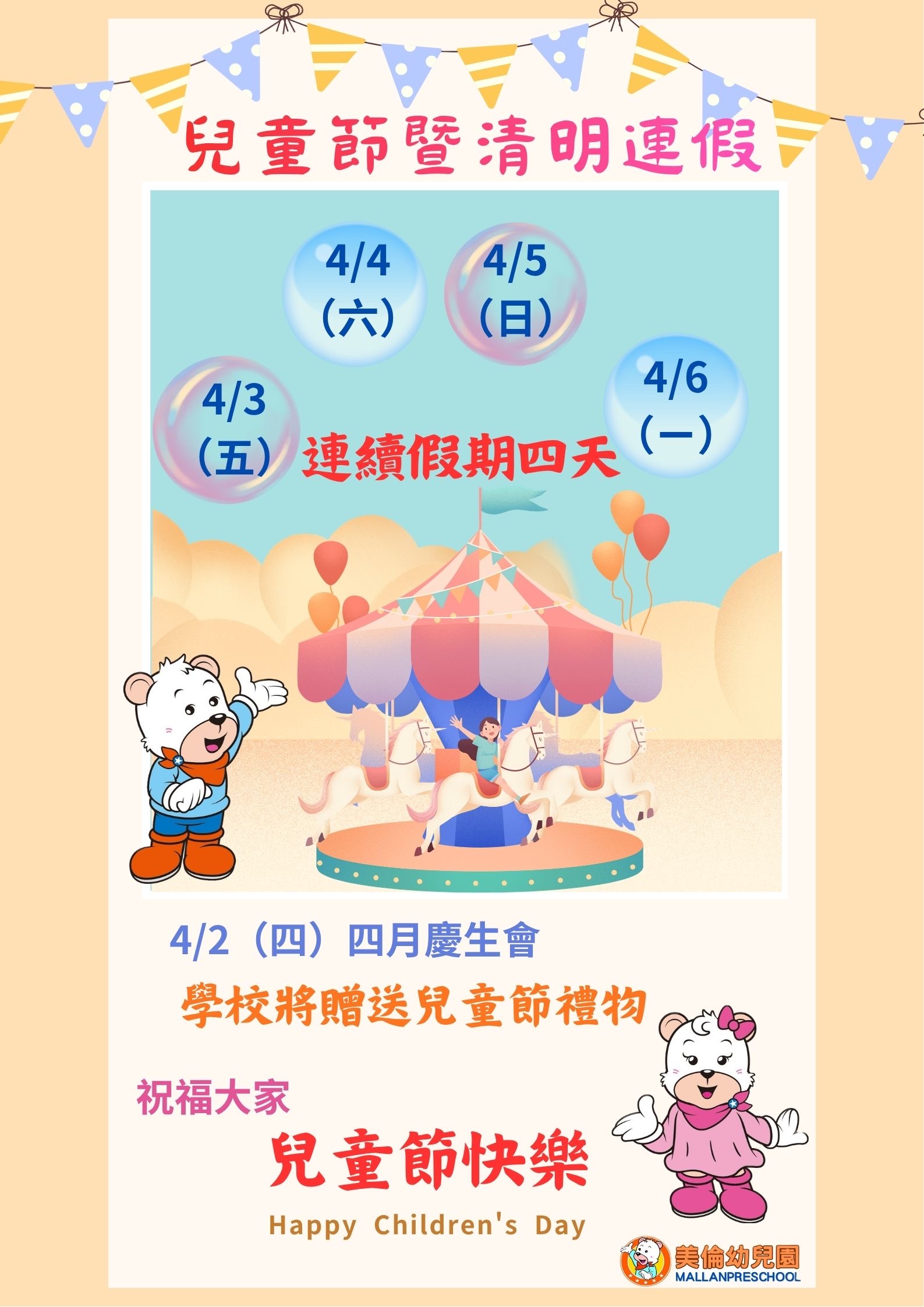 4月3日(五)至4月6日(一)為兒童節暨清明節連續假期四天